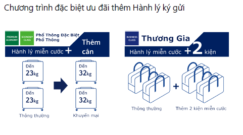 Hành lý miễn cước theo quy định + thêm 2 kiện (Mỗi kiện không quá 32kg)