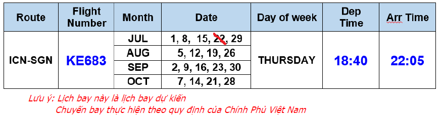 Korean Air xin chân thành cảm ơn sự đồng hành từ Quý đại lý trong suốt thời gian qua. Do tình hình dịch bệnh diễn biến phức tạp tại Việt Nam, Hãng xin được điều chỉnh lại lịch bay dành cho chuyên gia trong tháng 7 năm 2021. Cụ thể như sau: