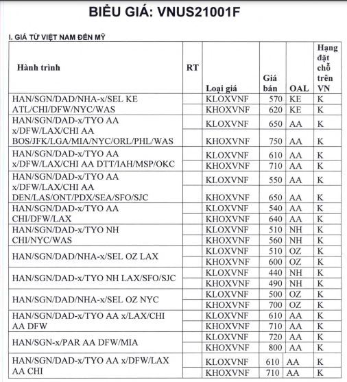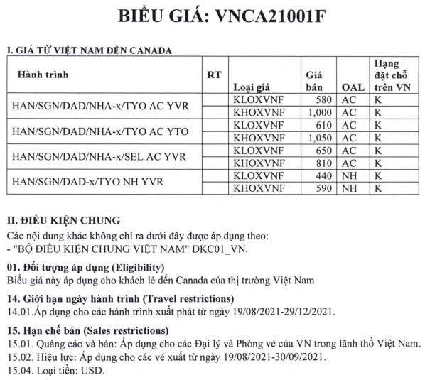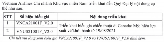 VIETNAM AIRLINES (VN): Thông báo Triển khai biểu giá chiến thuật Canada VNCA21001F_V2.0 và Mỹ VNUS21001F_V2.0