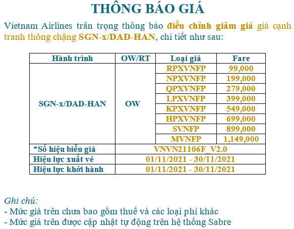 VIETNAM AIRLINES (VN): Thông báo Triển khai điều chỉnh giảm giá giá chiến thuật thông chặng SGN-x/DAD-HAN
