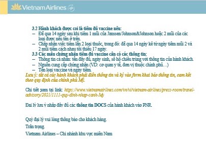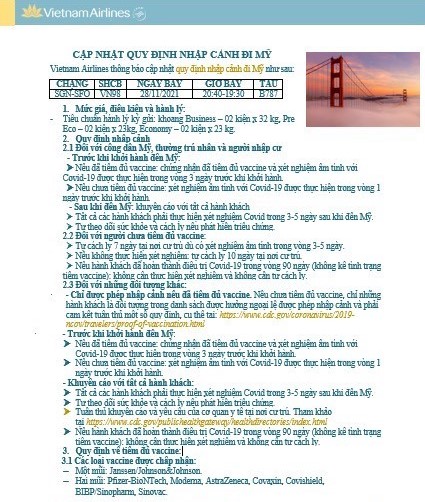 VIETNAM AIRLINES (VN): Cập nhật quy định nhập cảnh đi Mỹ