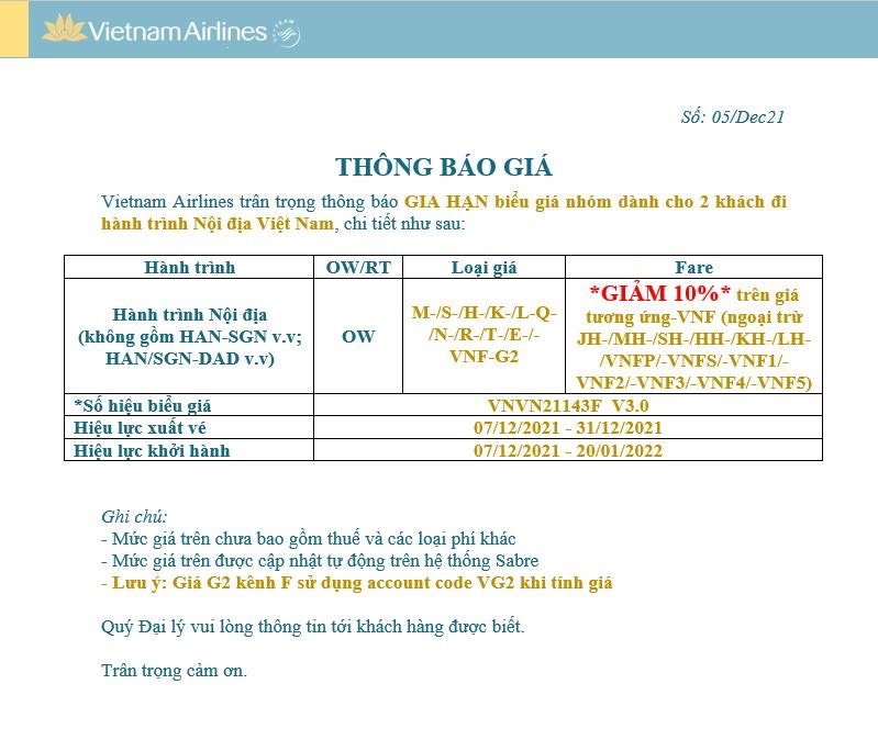 Liên Lục Địa xin gửi tới Quý đại lý thông báo của VIETNAM AIRLINES (VN) về việc Gia hạn biểu giá nhóm dành cho 2 khách đi hành trình nội địa Việt Nam với nội dung chi tiết như sau: