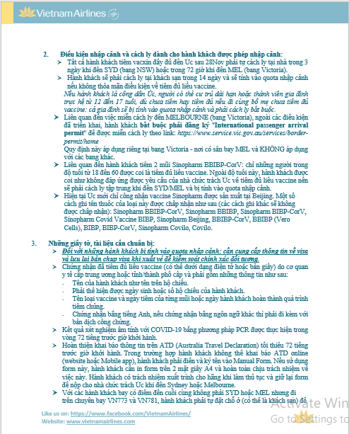 VIETNAM AIRLINES (VN): Thông báo cập nhật quy định trên chuyến bay từ Việt Nam đi Úc