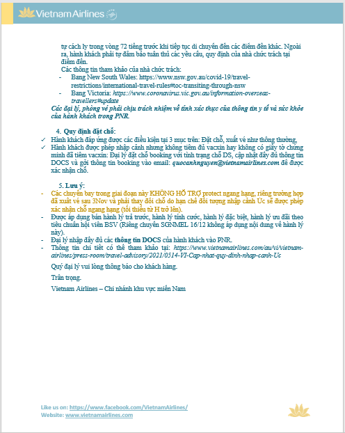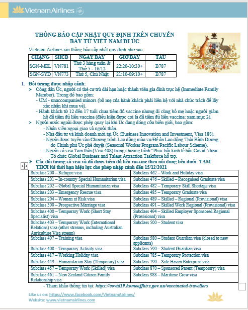 Liên Lục Địa xin gửi tới Quý đại lý thông báo của VIETNAM AIRLINES (VN) về Thông báo cập nhật quy định trên chuyến bay từ Việt Nam đi Úc với nội dung chi tiết như sau: