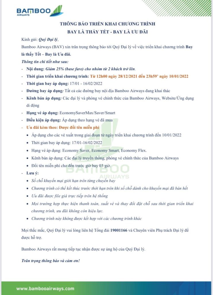Liên Lục Địa xin gửi tới Quý đại lý thông báo của BAMBOO AIRWAYS (QH) về việc Triển khai chương trình Bay là thấy Tết – Bay là ưu đãi với nội dung chi tiết như sau: