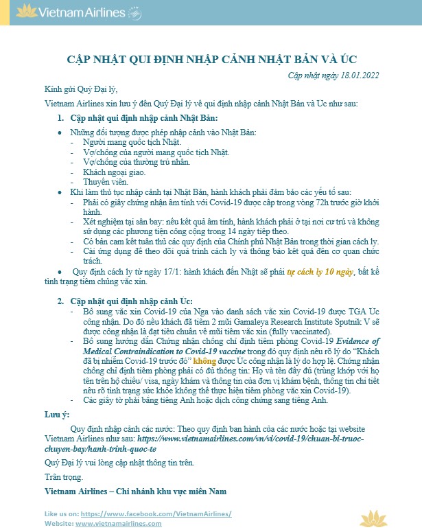 Liên Lục Địa xin gửi tới Quý đại lý thông báo của VIETNAM AIRLINES (VN) về việc Cập nhật quy định nhập cảnh Nhật Bản và Úc với nội dung chi tiết như sau: