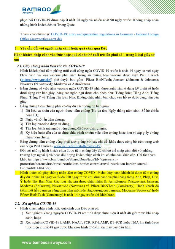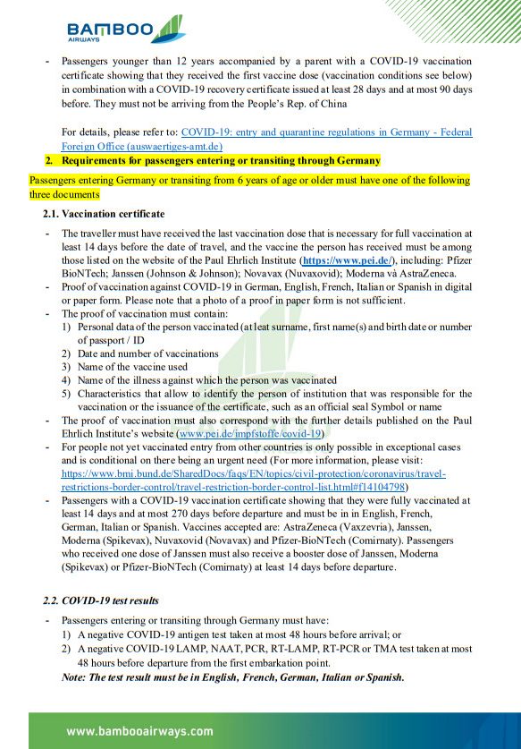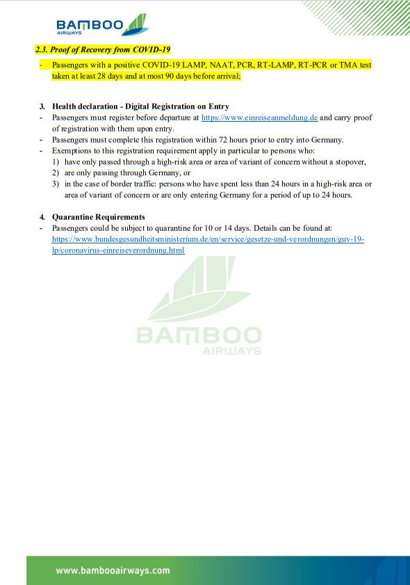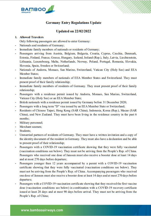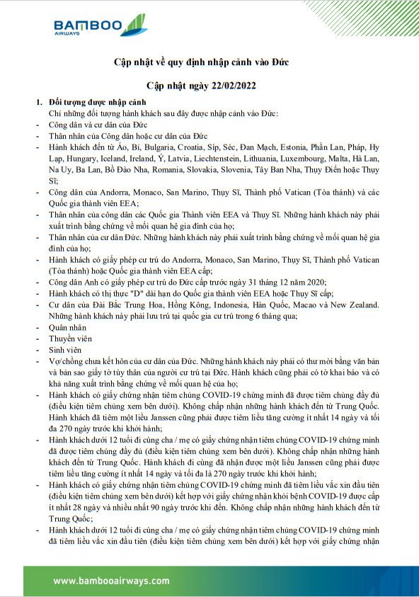 BAMBOO AIRWAYS (QH): Cập nhật về quy định nhập cảnh vào Đức – Cập nhật ngày 22/02/2022