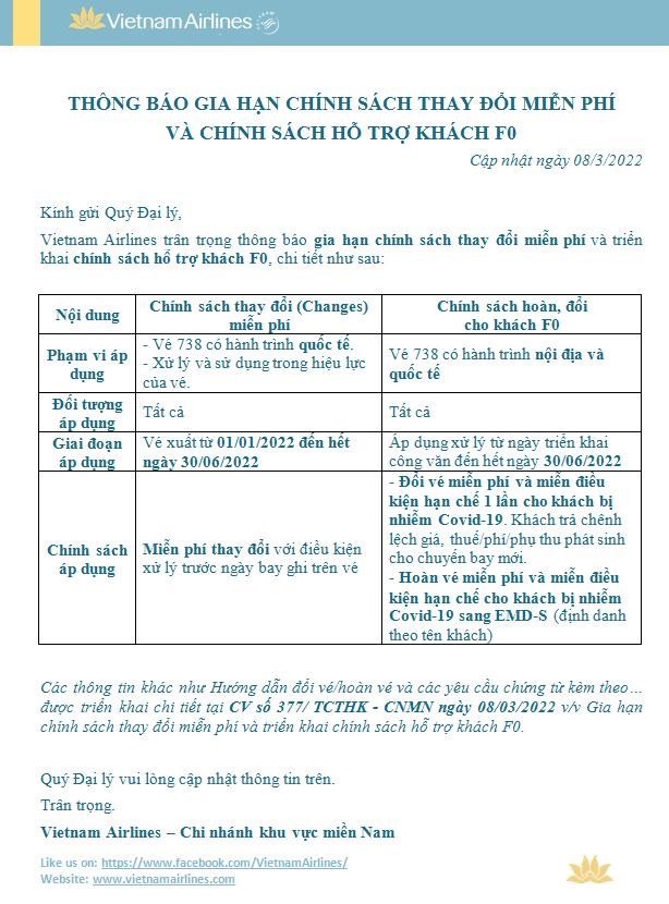 VIETNAM AIRLINES (VN): Thông báo gia hạn chính sách thay đổi miễn phí và chính sách hỗ trợ khách F0
