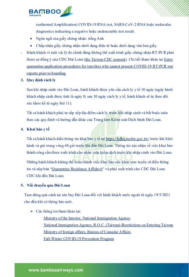 BAMBOO AIRWAYS (QH): Thông báo quy định nhập cảnh vào Đài Loan