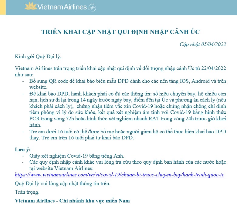 Liên Lục Địa xin gửi tới Quý đại lý thông báo của VIETNAM AIRLINES (VN) về việc Triển khai cập nhật quy định nhập cảnh Úc với nội dung chi tiết như sau: