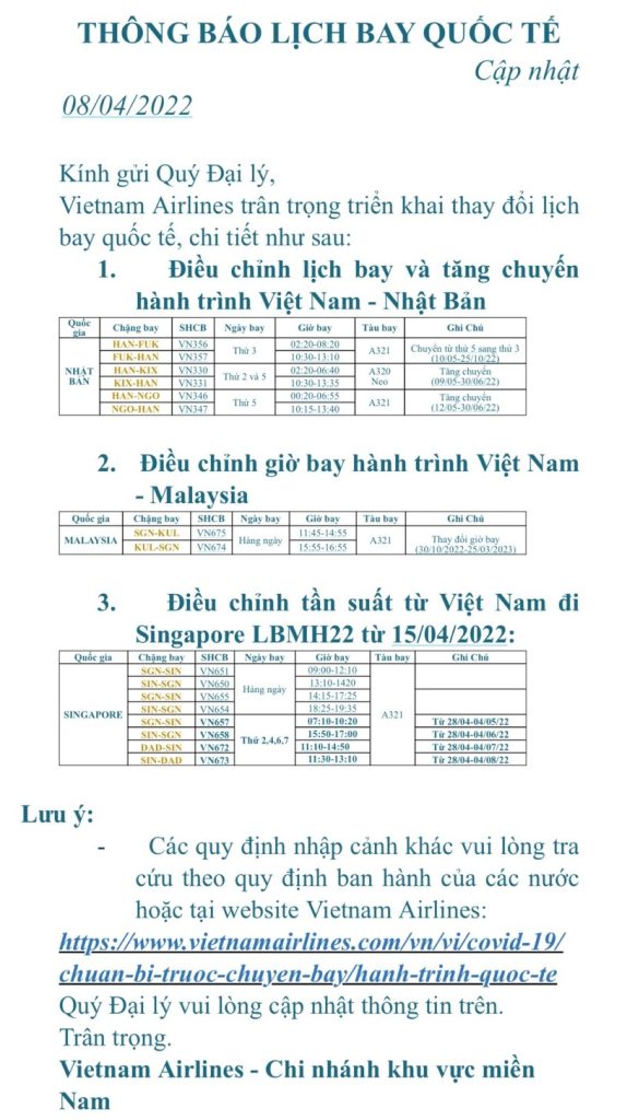 VIETNAM AIRLINES (VN): Thông báo lịch bay Quốc tế