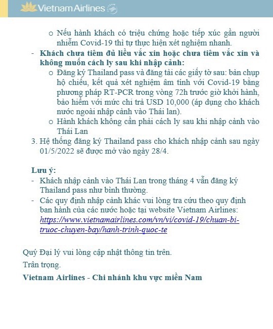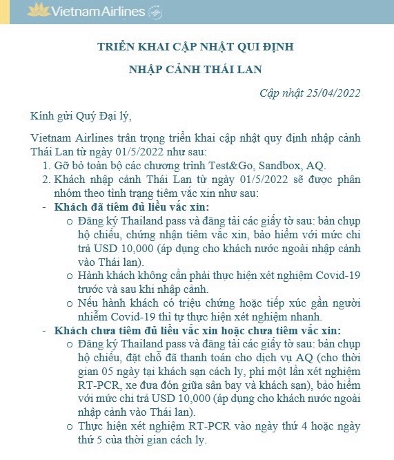 Liên Lục Địa xin gửi tới Quý đại lý thông báo của VIETNAM AIRLINES (VN) về việc Triển khai cập nhật qui định nhập cảnh Thái Lan với nội dung chi tiết như sau: