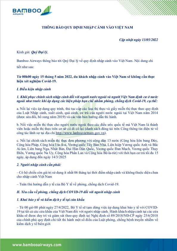 Liên Lục Địa xin gửi tới Quý đại lý thông báo của BAMBOO AIRWAYS (QH) về Qui định nhập cảnh vào Việt Nam với nội dung chi tiết như sau: