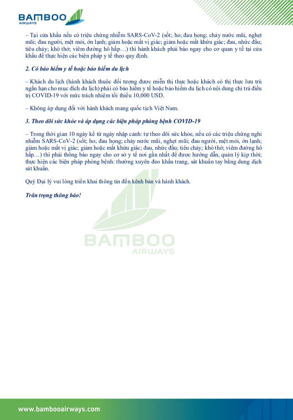 BAMBOO AIRWAYS (QH): Thông báo qui định nhập cảnh vào Việt Nam
