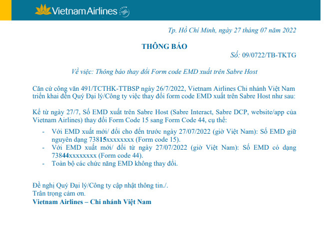 Liên Lục Địa xin gửi tới Quý đại lý thông báo của VIETNAM AIRLINES (VN) về việc Thay đổi Form code EMD xuất trên Sabre Host với nội dung chi tiết như sau: