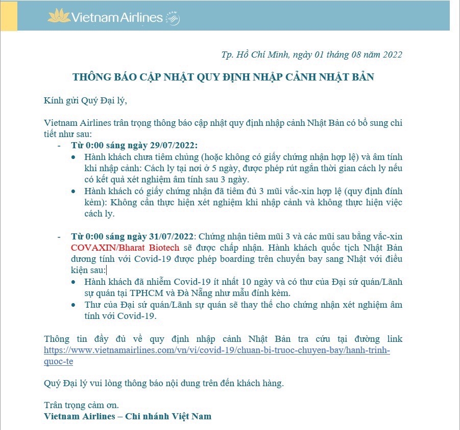 Liên Lục Địa xin gửi tới Quý đại lý thông báo của VIETNAM AIRLINES (VN) về việc Cập nhật quy định nhập cảnh Nhật Bản với nội dung chi tiết như sau: