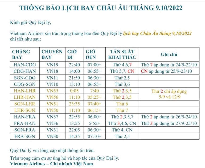 VIETNAM AIRLINES (VN): Thông báo lịch bay Châu Âu tháng 9,10/2022