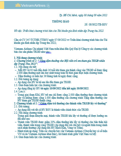 Liên Lục Địa xin gửi tới Quý đại lý thông báo của VIETNAM AIRLINES (VN) về việc Triển khai chương trình bán cho Tài khoản gia đình nhân dịp Trung thu 2022 với nội dung chi tiết như sau: