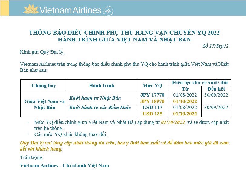 Liên Lục Địa xin gửi tới Quý đại lý thông báo của VIETNAM AIRLINES (VN) về việc Điều chỉnh phụ thu hãng vận chuyển YQ 2022 hành trình giữa Việt Nam và Nhật Bản với nội dung chi tiết như sau: