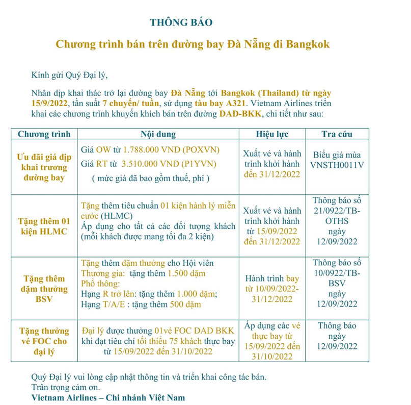 Liên Lục Địa xin gửi tới Quý đại lý thông báo của VIETNAM AIRLINES (VN) về Chương trình bán trên đường bay Đà Nẵng đi Bangkok với nội dung chi tiết như sau: