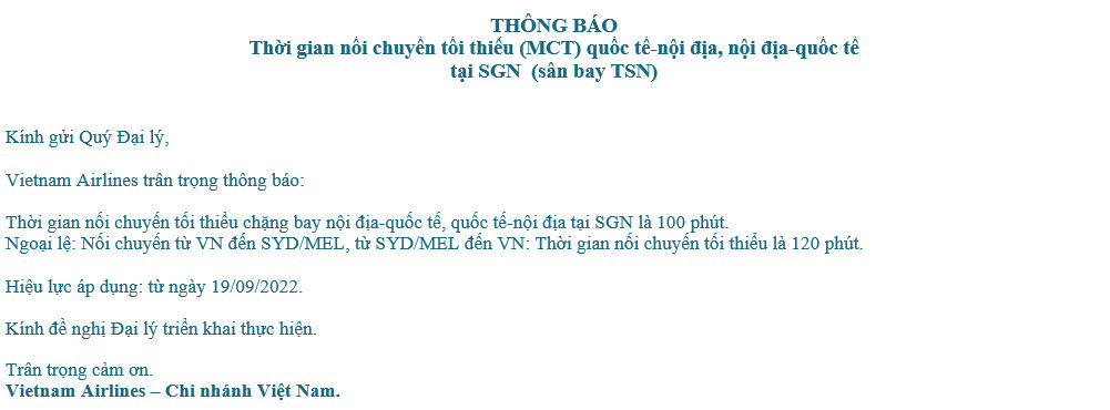 Liên Lục Địa xin gửi tới Quý đại lý thông báo của VIETNAM AIRLINES (VN) về việc Thời gian nối chuyến tối thiểu (MCT) quốc tế – nội địa, nội địa – quốc tế tại SGN (sân bay TSN) với nội dung chi tiết như sau: