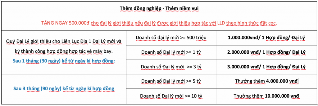 Giữ vững nguyên tắc “Cùng nhau hợp tác – lợi ích dài lâu”, cùng mục tiêu chung là phát triển hệ thống đại lý vé máy bay Lien Luc Dia Corp bền vững và tiến bộ, cũng như tri ân sự giúp đỡ và ủng hộ của toàn thể anh/ chị/ em đại lý, Liên Lục Địa xin mang đến một chương trình hấp dẫn dành cho Quý đại lý trong năm nay, chương trình mang tên “Thêm đồng nghiệp – Thêm niềm vui” với nội dung chi tiết như sau: