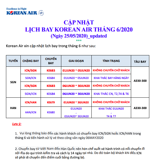 Liên Lục Địa xin gửi tới Quý đại lý thông báo của KOREAN AIR (BR) về Lịch bay 6/2020 (Cập nhật 25/05/2020) với nội dung chi tiết như sau: