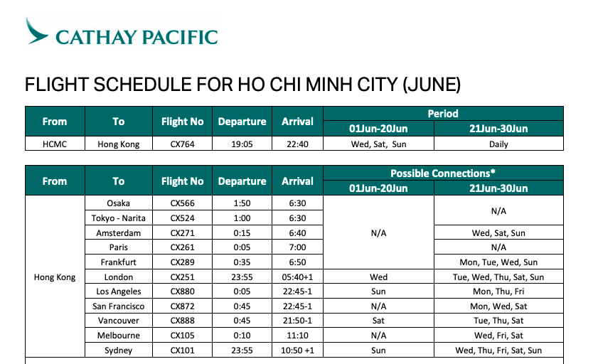 Hãng hàng không Cathay Pacific gửi Anh/Chị cập nhật lịch bay giai đoạn 01/06 – 30/06/2020, khởi hành từ Tp. Hồ Chí Minh như sau: