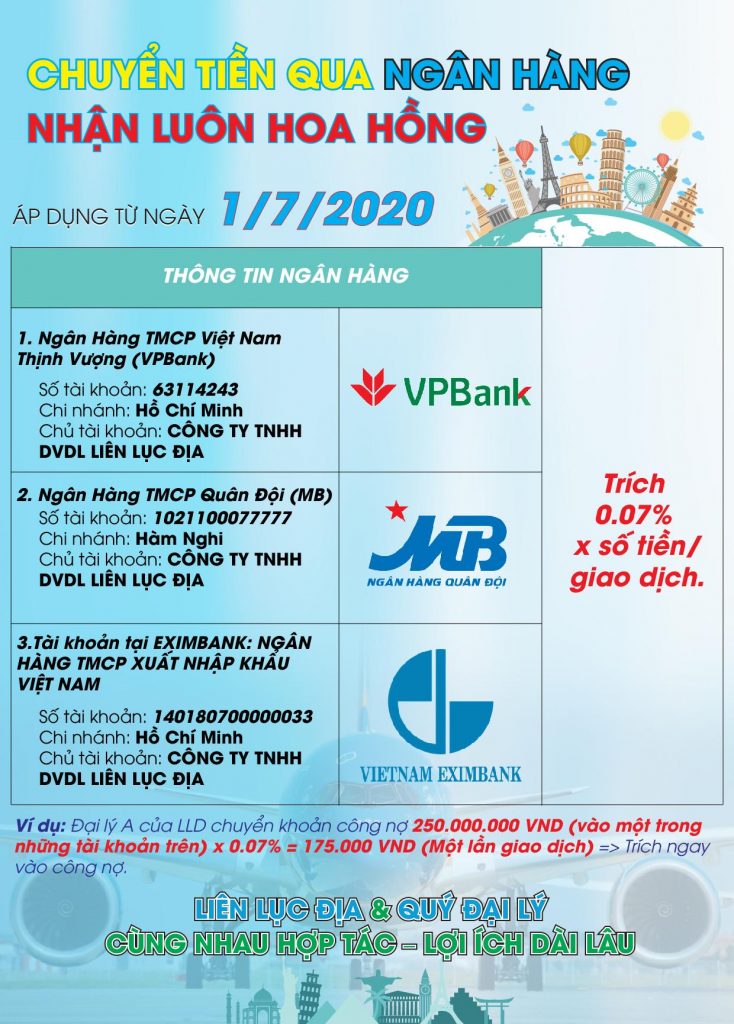Từ 01/01/2020, Liên Lục Địa triển khai thực hiện chiết khấu 0.07%/ tổng số tiền giao dịch khi đại lý thực hiện các giao dịch thanh toán qua 3 ngân hàng sau: VPBank, MB Bank, EXIMBANK. Như vậy, từ 01/07/2020, Liên Lục Địa sẽ ngưng thưởng thêm chiết khấu đối với 2 ngân hàng là VIB, MSB.
