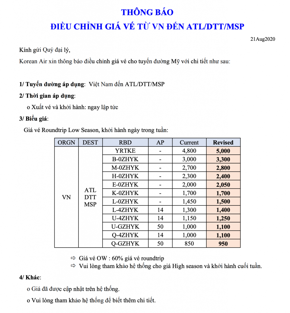 Liên Lục Địa xin gửi tới Quý đại lý thông báo của KOREAN AIR (KE) về việc Điều chỉnh giá vé từ VN đến ATL/DTT/MSP, hiệu lực 21/08/2020 với nội dung chi tiết như sau: