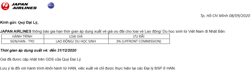 Liên Lục Địa xin gửi tới Qúy đại lý thông báo của JAPAN AIRLINES (JL) về việc Ưu đãi loại giá Lao Động / Du học sinh với nội dung chi tiết như sau: