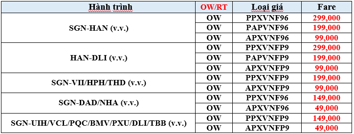 1.  Mở bán cạnh tranh trên các chuyến bay liên doanh VN và BL (có số hiệu chuyến bay VN6000-6999) chi tiết như sau: