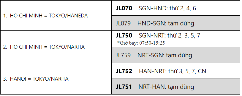 Trong khi các chuyến bay thương mại từ Nhật Bản về Việt Nam đang tạm dừng do hạn chế nhập cảnh, JAL tiếp tục thực hiện các chuyến bay đặc biệt dành cho chuyên gia vào Việt Nam, chi tiết tham khảo tại đây: