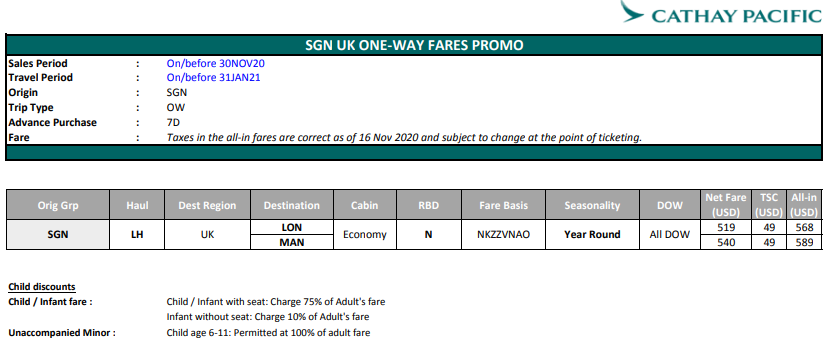 Liên Lục Địa xin gửi tới Qúy đại lý thông báo của CATHAY PACIFIC (CX) về Khuyến mãi một chiều SGN-UK với nội dung chi tiết như sau: