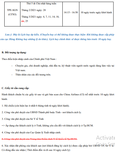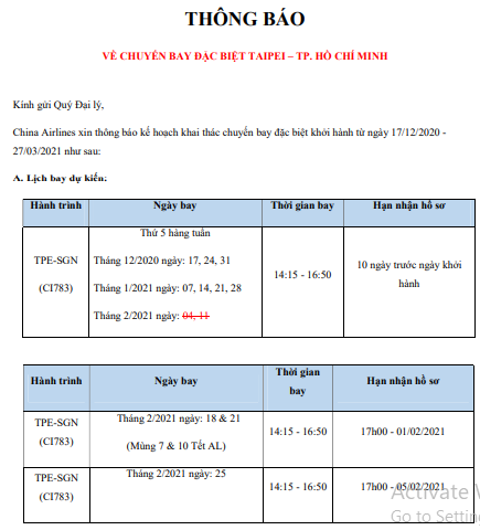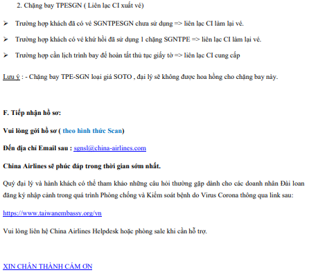 CHINA AIRLINES (CI): Thông báo về việc cập nhật quy định nhận hồ sơ chuyến bay TPE- SGN giai đoạn 01/02 – 31/03/2021
